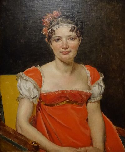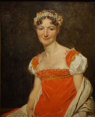 David peint entre 1810 et 1813 les portraits de sa femme, de ses filles jumelles et de ses gendres selon un schéma semblable, formant une série. Pauline porte une robe identique à celle de sa sœur jumelle Émilie. Elle aussi a épousé un militaire, anobli au titre de baron de l’Empire en 1811. Son sourire très marqué traduit le caractère intime du portrait, resté inachevé également. |