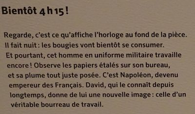 Le commanditaire de cette œuvre, un noble écossais admirateur de Napoléon, souhaitait le voir représenté dans un des événements qui l’ont immortalisé. De manière surprenante, David peint l'Empereur au travail dans son bureau du palais des Tuileries. Il est 4h15 du matin comme l’indiquent l'horloge et les bougies consumées. Sur le bureau est posé le code Napoléon. Cette effigie du souverain en homme d’État donnant des institutions à la France renouvelle profondément les codes de représentation traditionnels. Elle servira de modèle à de nombreux portraits de présidents de la République aux 19e et 20e siècles. |