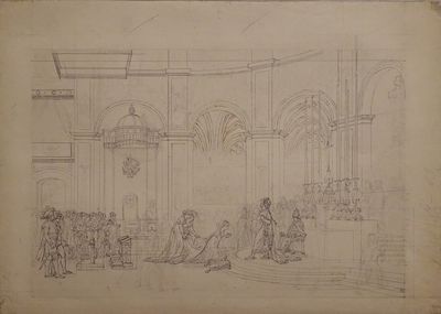 Jacques-Louis David. Jacques-Louis David et Ignazio Eugenio Degotti (1758-1824). Étude de perspective pour le Couronnement, 1805-1806. Mine de plomb et reprises partielles à la plume, encres noire et brune. Paris, musée du Louvre, département des Arts graphiques.