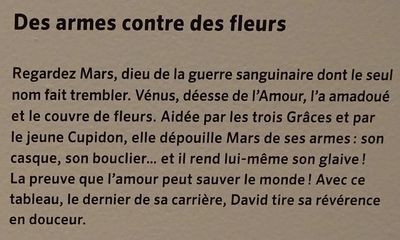 Testament artistique de David, exposé à Paris à partir du 26 mai 1824, ce dernier tableau d’histoire reprend un thème archaïque: les amours de Mars et Vénus. Faut-il voir dans ce sujet apparemment anachronique l’allégorie d’une peinture d’histoire où l’héroïsme, qui a porté David tout au long de sa carrière, est en train de céder à l’érotisme, où la dimension politique de l’art s’abolit dans le culte du beau pour le beau? David semble anticiper ici ce qui perturbera bientôt les arts: le kitsch. C’est probablement une charge contre son élève Ingres, qu’il décrit comme «séduisant, mais dangereux». La composition rappelle celle de Jupiter et Thétis et Vénus, la Grande Odalisque, qui désarmerait un Mars évoquant Léonidas. |