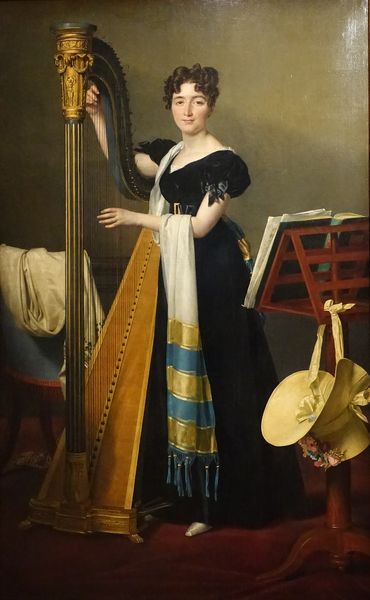 Cousine des nièces de Napoléon Ier, Zénaïde et Charlotte Bonaparte, la jeune femme est peinte en train d'accorder sa harpe. Le caractère solennel et fastueux du portrait en pied, augmenté par la monumentalité de l’instrument de musique, est tempéré par le sourire du modèle et par la nature morte spontanée au premier plan. La perfection géométrique de la composition, l’audacieuse harmonie colorée qui oppose le rouge sombre, le noir aux subtilités des blancs, des crèmes et des dorés, sont contrebalancés par le visage ingrat du modèle, traité avec son habituel réalisme sans concession. |