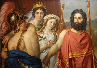 Pour conjurer le sort qui retarde l'attaque de Troie, le roi grec Agamemnon accepte de sacrifier la vie de sa fille Iphigénie. Cette décision désespère la reine Clytemnestre et suscite la colère du héros Achille. David résume la tension de cette situation en regroupant les personnages dans un cadrage serré. Il réactive ainsi un exercice académique de sa jeunesse: peindre des têtes d'expression, effort de traduction plastique des passions humaines. |