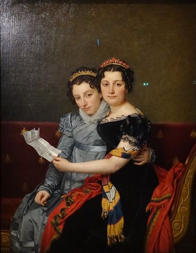 Les modèles sont des nièces de l’empereur Napoléon Ier. À la chute de l'Empire, elles s’exilent à Bruxelles avec leur mère, tandis que leur père, Joseph Bonaparte (1768-1844), se réfugie aux États-Unis. David les représente lisant des nouvelles qu’il leur envoie. L’intimité et l'affection des sœurs n’excluent pas le faste impérial des peignes-diadèmes et du riche canapé garni de velours brodé d’abeilles d’or, emblèmes de la dynastie Bonaparte. |