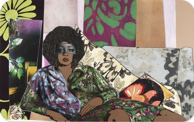 Mickalene Thomas. Keri On, 2009. Photographie couleur, collage de linoléum et de papier sur carton d’archivage, 46,99 x 40 cm. Courtesy de l’artiste. |