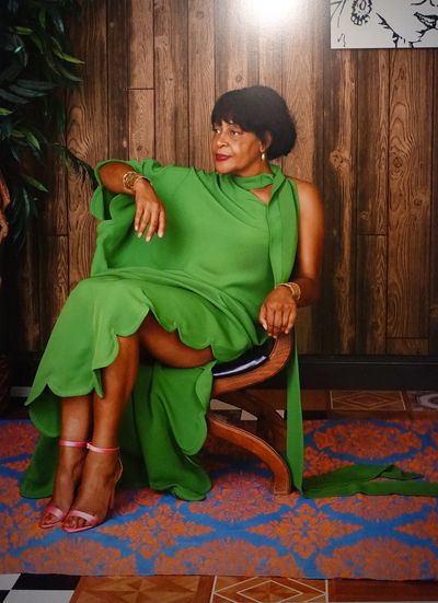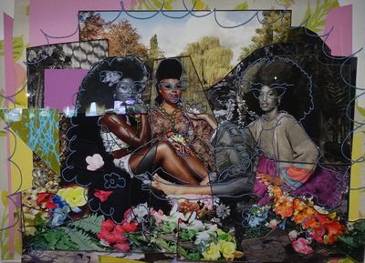 L'artiste remplace ces figures blanches par un trio de femmes noires parées de coiffures afro et de robes aux riches imprimés colorés évoquant les années 1970, apogée des mouvements pour les droits civiques et Black is Beautiful aux États-Unis. Confortablement et fièrement installées dans cet espace conçu pour elles, les trois amies de l'artiste nous toisent tout autant que nous les regardons, créant un rapport de reconnaissance et d'approbation. À travers cette réinterprétation picturale d'un motif canonique, elle remet en cause l'entre-soi de l'histoire de l'art traditionnelle, tout en célébrant la sororité et la joie noires. |