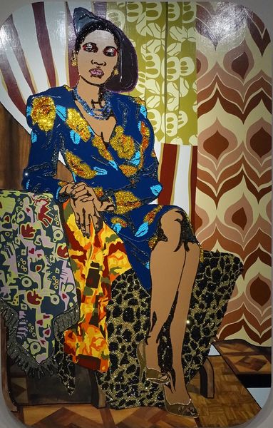 Mickalene Thomas. Portrait of Marie, 2015. Strass, peinture acrylique et à l’huile sur toile montée sur panneau de bois, 121,9 X 91,4 X 5,1 cm. Collection privée. |