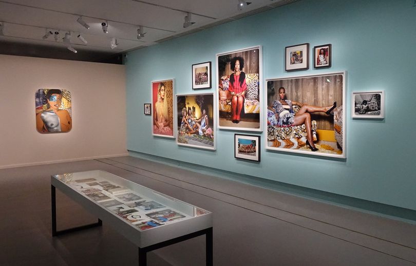 Sous son objectif, les modèles posent dans des tenues choisies ou créées par l’artiste, comme pour l’œuvre Déjeuner sur l’herbe : trois femmes noires. Mickalene Thomas entretient un rapport intime à la mode, qui lui vient d’abord de sa mère mannequin, Sandra Bush, présente dans deux photographies de cette salle. Elle envisage le style vestimentaire comme un geste radical d’affirmation de soi. Les tenues de ses modèles – vêtements aux couleurs vives et aux motifs complexes – vont directement puiser dans l’esthétique «super-fly» [issue des films blaxploitation] des années 70, étroitement liés à l’émancipation des noirs américains dans le sillage du mouvement de lutte pour les droits civiques. Utilisées au départ comme de simples ressources pour ses peintures, les photographies deviennent ensuite des œuvres à part entière, au côté des collages qui témoignent ici de l’étendue de son travail, depuis les pochettes d’album jusqu’aux illustrations d’articles et à ses propres prises. Quant à ses modèles, on compte parmi les plus notables sa mère, mais aussi la chanteuse Solange Knowles et l’artiste Carrie Mae Weems.