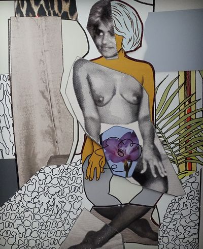 Mickalene Thomas. Nus Exotique #6, 2023. Photographie couleur, papier mixte, strass et peinture acrylique sur papier monté sur Dibond, 94,3 x 94,3 x 6,67 cm. Collection privée.