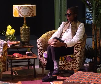 Mickalene Thomas assise dans l'installation ci-dessus durant les interviews des journalistes. Photo Spectacles Sélection. |