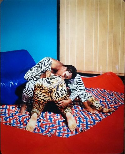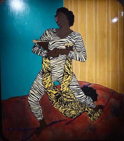 Avec la série Brawlin Spitfire Wrestlers, réalisée plus tôt dans sa carrière (2005-2007), Mickalene Thomas explore les différentes facettes de sa personnalité. Ces œuvres, réalisées avec la collaboration de l’artiste Kalup Linzy, sont autant de représentations d’elle-même où seul son visage apparaît. Les contorsions des figures luttant entre elles incarnent de façon semi-autobiographique les conflits internes qui surgissent entre nos identités multiples, notamment dans notre relation au reste de la société. Les personnages enlacés brouillent la frontière entre le plaisir érotique et la douleur, la lutte et l’affection, la domination et la soumission, multipliant les expressions du désir. L’artiste s’inspire ici à la fois de la mythologie des Amazones, incarnées aujourd’hui par des héroïnes de comics comme Wonder Woman, Shuri, Ninja G, ou Martha Washington, et de la tradition iconographique des lutteuses, de l’Antiquité aux sculptures du XVe siècle de l’Italien Antonio Pollaiuolo; autant de représentations de femmes fortes et séduisantes dans des positions de lutte violente, porteuses d’une réflexion sur la complexité d’être perçue comme telle. Les justaucorps à motifs zèbre ou léopard arborés par les lutteuses peuvent être vus comme une critique des représentations volontairement stéréotypées de la femme noire comme agressive ou hypersexualisée – clichés développés pendant les périodes coloniales puis esclavagistes, et qui perdurent encore aujourd’hui.