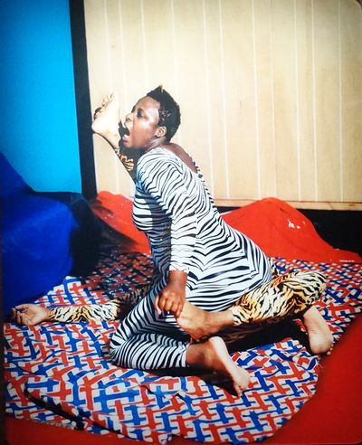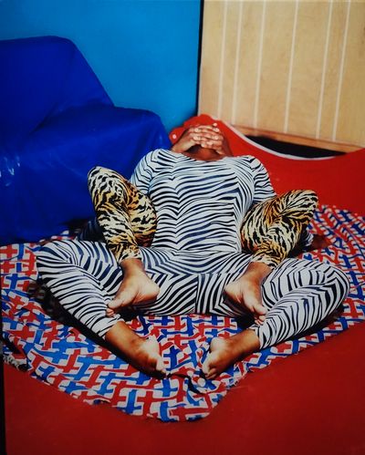 Din, l’une des muses de longue date de Mickalene Thomas, est ici représentée dans une scène intime, entourée d’un riche décor de textiles à motifs.