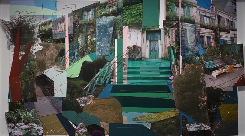 Pour concevoir ce collage monumental, Thomas s'est appuyée sur la cinquantaine de collages de petits formats réalisés à partir de ses photographies du domaine. Par un jeu sur les impressions, les degrés de résolution et les intensités chromatiques, magnifiés par les cristaux Swarovski qui surlignent les formes de la végétation et de la maison, elle crée une œuvre immersive qui transcrit sa propre expérience des lieux.