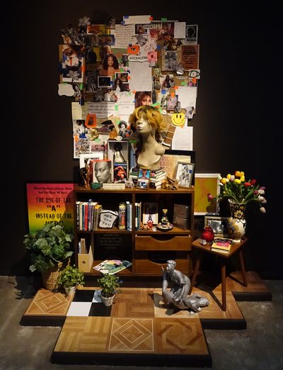 Dans l’installation présentée ici, Thomas explore la manière dont notre identité est façonnée par les espaces que nous habitons, les vêtements que nous portons, la musique que nous écoutons et les livres que nous lisons. |