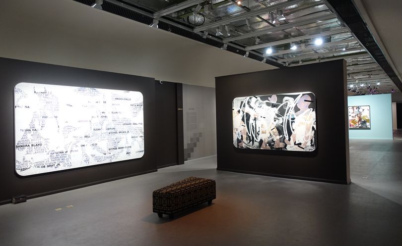 Des images sérigraphiées de violences policières exercée contre les manifestants dans les années 1960 sont superposées sur la toile. Au centre, l’image d’Amelia Boynton Robinson, figure majeure du mouvement des droits civiques, est portée par d’autres manifestants en soutien à la militante blessée par la police lors d’une manifestation à Selma, Alabama, en 1965. Cet événement, connu sous le nom de «Bloody Sunday», a joué un rôle de catalyseur dans la décision d'adoption de la loi sur le droit de vote de 1965, qui visait à mettre fin à la discrimination raciale pour accéder à ce droit. |