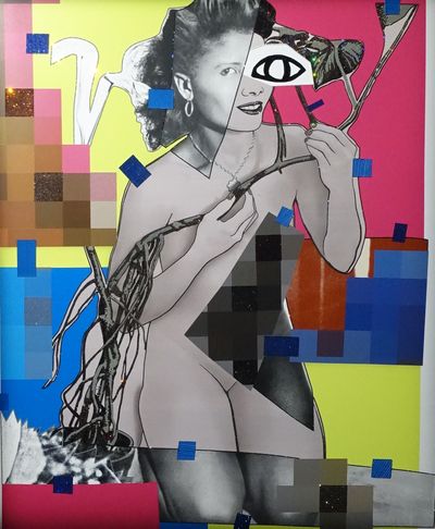 Mickalene Thomas. Nus Exotique #2, 2023. Photographie couleur, papier mixte, peinture acrylique et strass sur papier musée monté sur Dibond, 105,89 x 107,37 x 6,67 cm. Collection privée. |