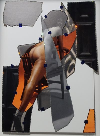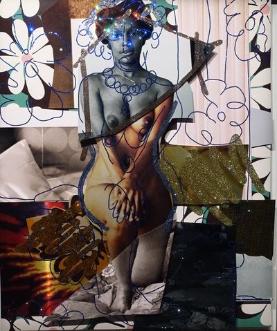 Mickalene Thomas. Jet Blue #15, 2020. Photographie couleur, papier mixte, strass, tissu en fibre de verre et cristaux Swarovski sur papier, 92,71 x 66,68 cm. Collection privée. |