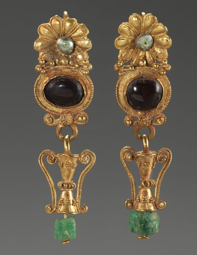 Boucles d'oreille à motif floral, IVe - IIe siècle avant J.-C. Or, perles, grenat, chrysoprase, 6,7 x 1,6 x 1,1 cm. Suisse, Genève, Fondation Gandur pour l’Art. |