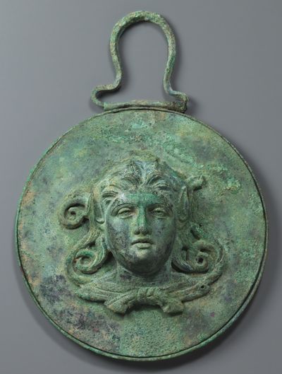 Miroir à boîte orné d'une tête de satyre, IVe siècle – IIIe siècle avant J.-C. Bronze, fonte pleine et décor appliqué, 18 x 13,4 x 5 cm. Suisse, Genève, Fondation Gandur pour l’Art. |