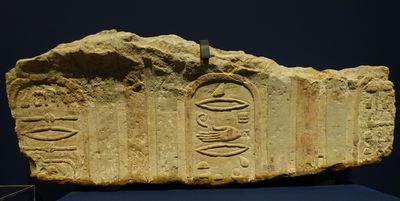 Corniche de temple aux cartouches de Cléopâtre VII et de Césarion. Époque ptolémaïque, vers 40 av. J.-C. Égypte, Coptos. Grès, polychromie. Lyon, musée des Beaux-Arts. |