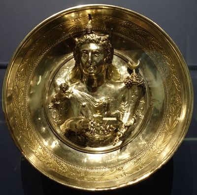Coupe « à l'Afrique » figurant peut-être Cléopâtre Séléné. Époque romaine, fin Ier siècle av. J.-C.- première moitié Ier siècle apr. J.-C. Italie, trésor de Boscoreale. Argent partiellement doré. Paris, Musée du Louvre, département des Antiquités grecques, étrusques et romaines. |