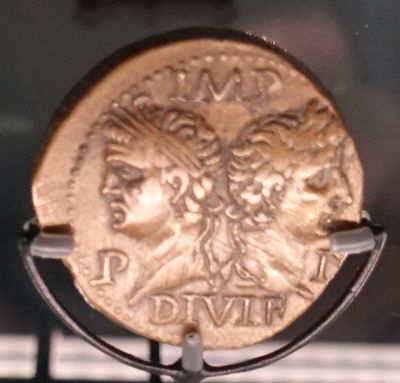 Dupondius d'Auguste, frappé à Nîmes (France). Droit : bustes d'Auguste et Agrippa. Revers: crocodile symbolisant l'Égypte conquise, 10-14 ap. J.-C. Bronze. Paris, Bibliothèque nationale de France, département des Monnaies, médailles et antiques. Ancien fonds 2759. |