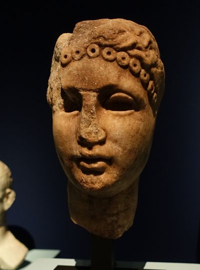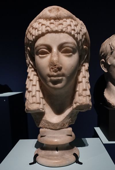 La rangée de bouclettes au-dessus du front, les cheveux coiffés vers l'arrière de la tête et noués en un petit chignon sont caractéristiques de l’iconographie de Cléopâtre dans la numismatique. Il n’est donc pas impossible que cette tête représente la célèbre reine. |