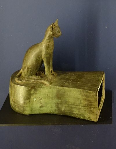 5 - Sarcophage de chat surmonté d’une statuette de la déesse égyptienne Bastet. Basse Époque, 664-332 av. J.-C. Alliage cuivreux. Paris, musée du Louvre, département des Antiquités égyptiennes.