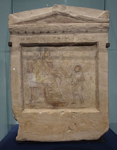 Stèle funéraire grecque figurant une défunte disant adieu à un petit garçon. Époque ptolémaïque, 323-250 av. J.-C. Égypte, Alexandrie. Calcaire peint. Paris, musée du Louvre, département des Antiquités grecques, étrusques et romaines.