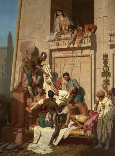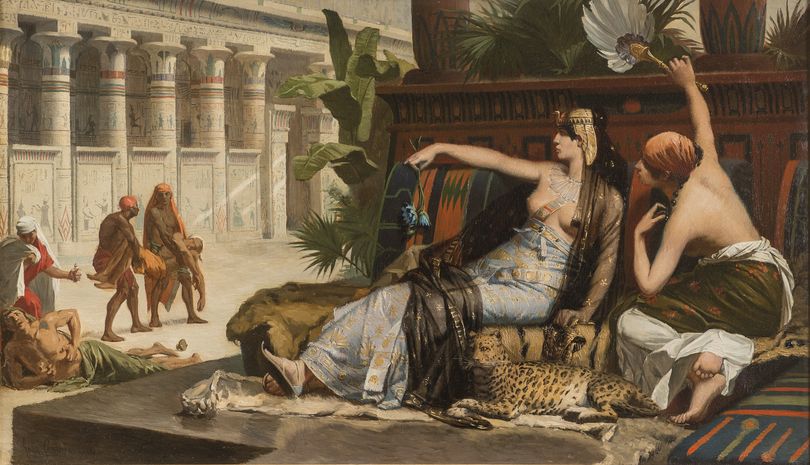 Vaincue à la bataille d'Actium par Octave, Cléopâtre se suicide en août 30 avant notre ère. Alors que ses sujets égyptiens et grecs la voient comme une déesse vivante garantissant la prospérité de son royaume, des auteurs romains, relayant la propagande du vainqueur, la qualifient de regina meretrix ou «reine prostituée».