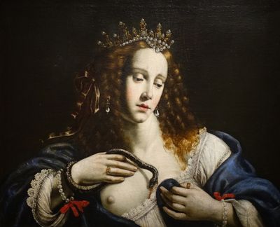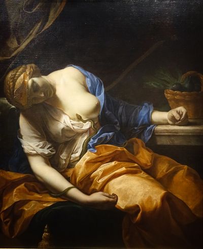 Peintre de style caravagesque dans l’Italie baroque, Guerrieri représente avec raffinement un modèle idéal de féminité avec cette Cléopâtre, tragique et sensuelle, tenant l’aspic sur sa poitrine: sa chemise en dentelles dévoile sa gorge laiteuse mordue par le serpent comme une étrange blessure d'amour. |