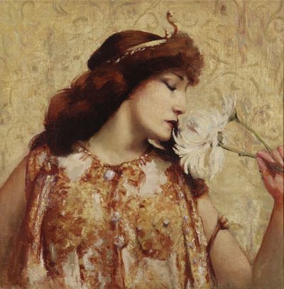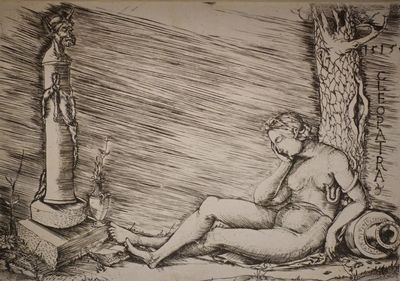 Se référant à l'Ève pécheresse, cette Cléopâtre assoupie est nue contre un tronc d'arbre: symbole de luxure, le serpent lui mord le téton et non le bras suivant les textes antiques. Un buste de satyre, mi-homme, mi-bouc, sur une colonne drapée d’une peau de chèvre semble la contempler avec lubricité. |