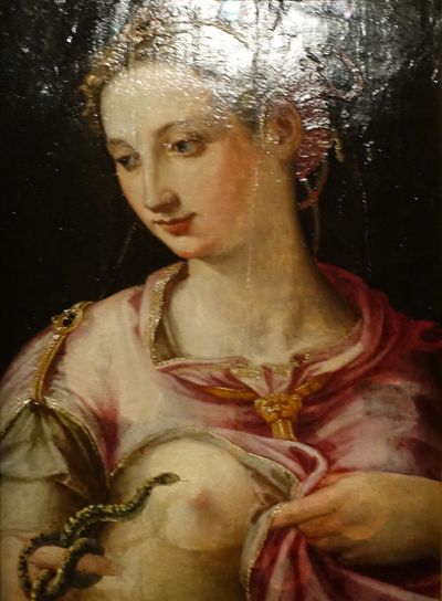 Au Grand Siècle de Louis XIV, la sculpture se prête à l'expression des passions: visage en marbre crispé sur un corps de Vénus dénudé, cette Cléopâtre est «entortillée d'un serpent qui lui picque (sic) la mamelle» (1686, inventaire des sculptures des jardins de Versailles). |