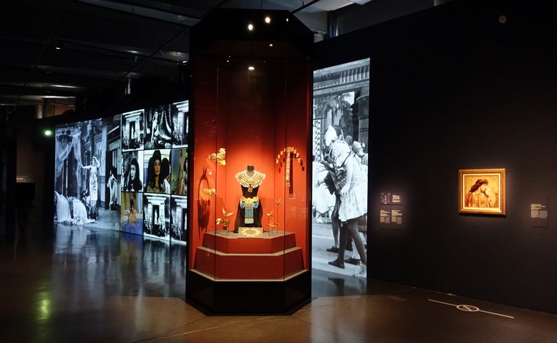 Après l’Aida de Verdi, créé en 1871 avec l’égyptologue Auguste Mariette, costumiers et joailliers s'inspirent de l'archéologie. En 1880, Eugène Lacoste (Paris, 1818-1907) conçoit pour cet opéra de fabuleux bijoux comparables à ceux exposés. Sarah Bernhardt qui les aime spectaculaires, leur accorde une place essentielle. |