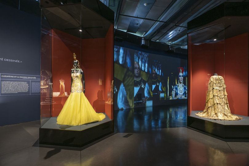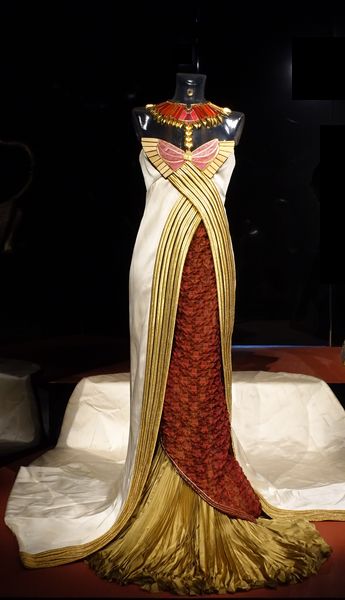 Philippe Guillotel (Paris, né en 1955). Costume pour Monica Belluci dans Astérix et Obélix: Mission Cléopâtre, film d'Alain Chabat, 2002. Robe de Cléopâtre perlée et sa coiffe. Bruxelles, Arts Talents enchères. |