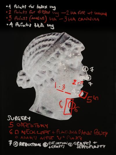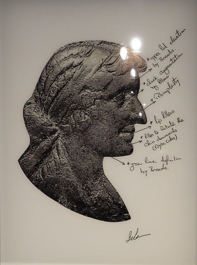 Esmeralda Kosmatopoulos (Grèce, née en 1981). About 2 inches-long. 2020 (production 2025). Installation d'une Nasothèque avec nez de dimensions variables. Marbre et acier. Le Caire, collection de l'artiste.