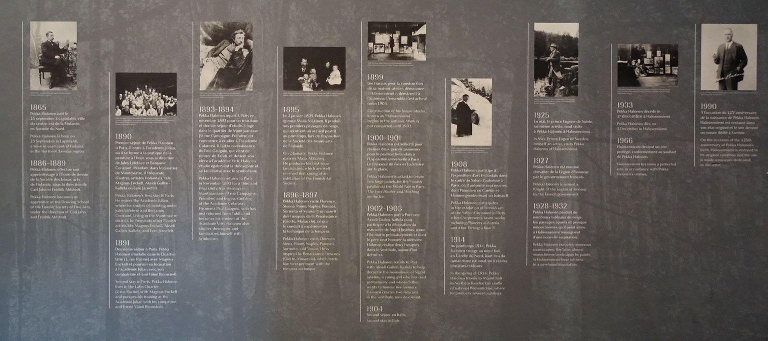 Akseli Gallen-Kallela s'impose comme le chantre de l’âme finlandaise, à travers les quatre fresques qu’il réalise pour orner les voûtes du hall d'entrée, inspirées de l'épopée nationale du Kalevala. Le peintre s'illustre également dans le domaine des arts décoratifs, avec la salle dédiée à la manufacture Iris. On peut y admirer plusieurs meubles et textiles réalisés sur ses dessins, notamment le Ryijy Flamme, une tenture à la composition dynamique et stylisée d’une grande modernité. |