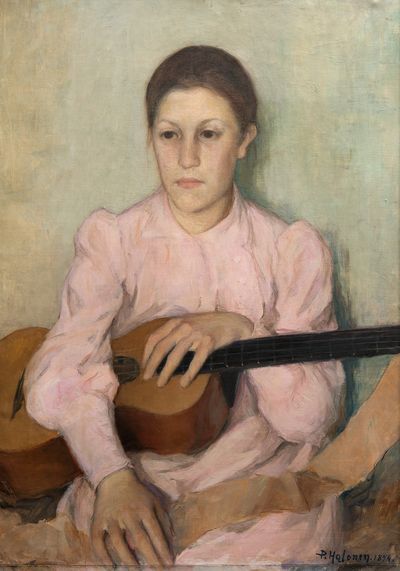 Pekka Halonen réalise plusieurs tableaux attestant de sa perméabilité au style synthétique de Paul Gauguin. C'est le cas de cette joueuse de guitare représentant sa belle-sœur Aino, dont le regard magnétique fascine le spectateur. La monumentalité sculpturale de la figure témoigne également de son regard sur le classicisme intemporel de Pierre Puvis de Chavannes: ses décors inspirés de l’art des fresques constituaient une référence incontournable pour les artistes nordiques de passage à Paris. |
