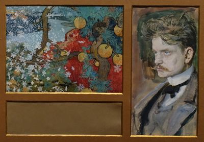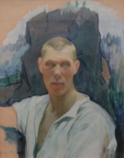 Sur cet autoportrait réalisé au milieu des années 1890, Pekka Halonen est au seuil de sa carrière: nourri des différentes tendances artistiques et philosophiques qu'il a côtoyées lors de ses séjours parisiens entre 1890 et 1894, il aspire à régénérer l'identité finlandaise en célébrant dans sa peinture la nature et les traditions. La palette dans une main, le pinceau levé dans l’autre, il nous regarde droit dans les yeux, en pleine maîtrise de sa technique picturale et prêt à conquérir sa place au sein de l’avant-garde internationale. |