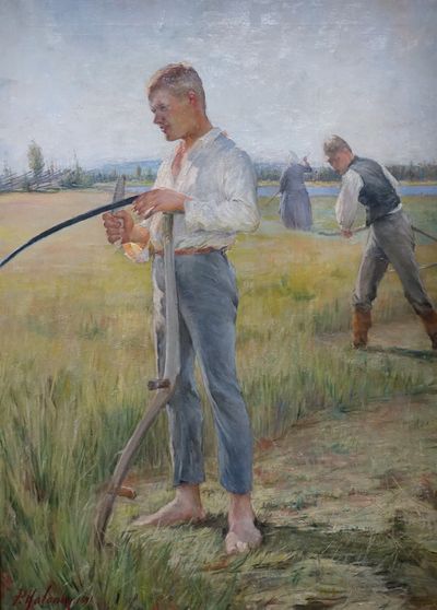 Lors de son premier séjour à Paris en 1890, Pekka Halonen trouve dans les œuvres naturalistes de Jules Bastien-Lepage et de Jean-François Millet le même idéal d'une coexistence harmonieuse entre l’homme et la nature. Il développe cette conception dans plusieurs tableaux, notamment Les Faucheurs. Peinte durant l'été 1891 à son retour en Finlande, l’œuvre représente des paysans travaillant paisiblement dans un champ ensoleillé. C’est le propre frère de l'artiste qui a posé pour la figure du premier plan. |