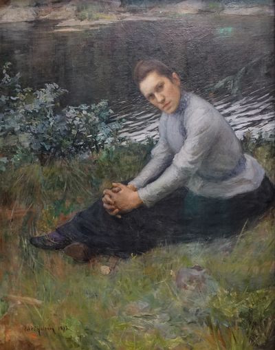Ce tableau a été peint sur les bords de la rivière Helylänjoki à Myllykylä, région natale de Maija Mäkinen, la fiancée de Pekka Halonen. La jeune femme représentée est la tante de Maija. Elle semble faire corps avec son environnement: le chemisier gris s’harmonise avec les reflets argentés de l’eau à l'arrière-plan, traités de manière quasi photographique. À l’inverse, les touffes d’herbe du premier plan paraissent floues. Ce tableau privilégiant l'étude de la lumière et l'observation de la nature est particulièrement influencé par l’art naturaliste de Jules Bastien-Lepage. |