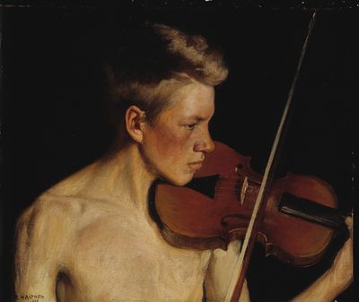 Pekka Halonen représente son frère Heikki, violoniste ayant fait ses gammes auprès des compositeurs Robert Kajanus (1856-1933) et Jean Sibelius (1865-1957). Néanmoins, il ne s’agit pas tant d’un portrait littéral que d’une incarnation de la Musique, comme en témoigne la nudité du modèle. La figure lumineuse émergeant de l'obscurité renforce l'atmosphère mystique et symboliste de l'œuvre. Éminent interprète, Heikki eut l’honneur de jouer comme premier violon lors du concert finlandais donné au Trocadéro pour l'Exposition universelle de Paris en 1900. |