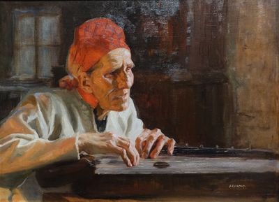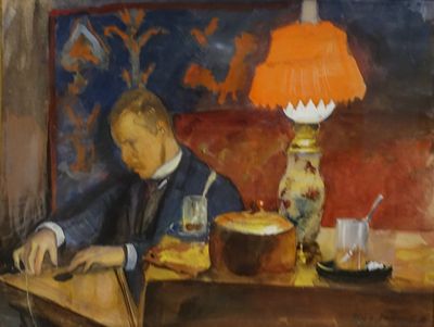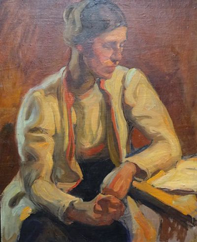 Durant l'été 1892, lors d’un voyage en Carélie (à l'est de la Finlande), Pekka Halonen rencontre une jeune pianiste, Maija Mäkinen. Le couple se marie trois ans plus tard, le 2 janvier 1895. Maija restera un pilier dans la vie et la carrière de l’artiste, lui donnant huit enfants. Pekka la représente à plusieurs reprises. Dans ce portrait de 1905, elle est vêtue d’un costume traditionnel de la région de Jääski. L'éclairage rougeoyant suggère qu’elle pose au coin du feu et fait écho à l’Autoportrait que son mari réalise en 1906. |