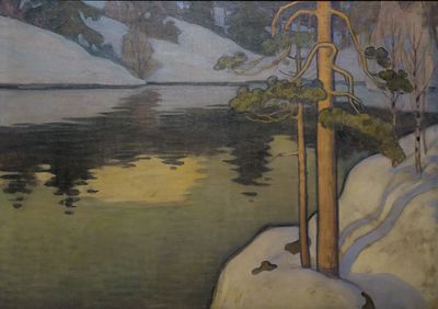 Pour le pavillon finlandais à l'Exposition universelle de Paris en 1900, Väinö Blomstedt réalise trois grands panneaux: Le Château d'Olavinlinna, Les Skieurs et Lac au rivage enneigé. Ce dernier tableau célèbre le «pays des mille lacs» et la beauté de la forêt en hiver. La représentation de cette saison, qui était considérée comme un thème national par excellence, n'était pas anodine dans le contexte patriotique du pavillon. |