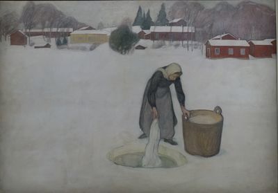 Pour le pavillon de la Finlande à l'Exposition universelle de Paris en 1900, Pekka Halonen réalise deux grands panneaux: Le Chasseur de lynx et La Lessive sur la glace, conçus comme un diptyque allégorique. De profil, le chasseur, aux aguets, dominant la forêt enneigée, incarne la vie sauvage. Parallèlement, la femme faisant sa lessive, courbée sur la glace, à quelques mètres de son village, personnifie la civilisation et le mode de vie rural. |