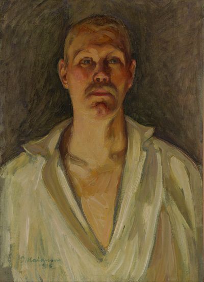 Cet autoportrait est vraisemblablement conçu comme un pendant pour le portrait de Maija vêtue en costume traditionnel de la région de Jääski, réalisé l’année précédente. On y retrouve en effet le même type de luminosité évoquant la lueur rougeoyante de l'âtre. En cette année 1906, Pekka Halonen est désormais un artiste établi et un père de famille comblé. Le cadrage à mi-corps, l'accent mis sur le visage et la chemise entrouverte accentuent le charisme du peintre et sa virilité pleinement assumée. |