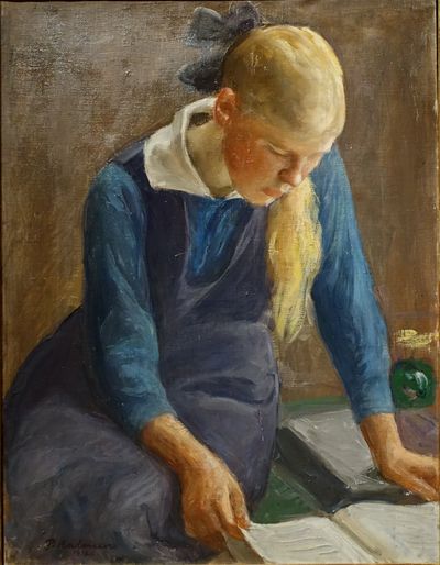 Pour le pavillon finlandais à l'Exposition universelle de Paris en 1900, Magnus Enckell réalise trois grands panneaux: Vue de Porvoo, La Salle de lecture et L'École primaire. Si le premier tableau met à l'honneur un site très pittoresque, les deux autres mettent l’accent sur l'instruction du peuple finlandais, d’un niveau d'éducation poussé jusque dans les classes les plus populaires. Cette dimension intellectuelle se ressent d’ailleurs fortement dans l’aile ouest du pavillon, consacrée à l’Administration générale des écoles, aux sociétés scientifiques, à l'Université et à la Presse. |