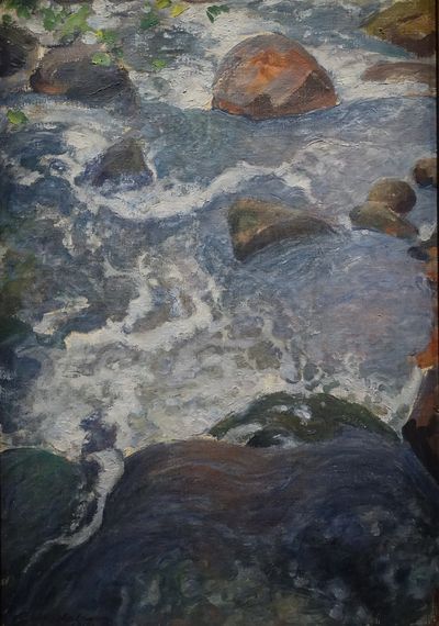 L'eau est un motif récurrent dans l'univers pictural de Pekka Halonen. Si la majeure partie de ses paysages mettent en scène la surface miroitante et plane du lac de Tuusula, le peintre a aussi puisé son inspiration dans d’autres sites plus dramatiques, tels les rapides de Kivikoski à Kuhmoinen, au centre-sud de la Finlande. Pekka Halonen y loue une ferme en 1916 et y retourne tous les étés, s’attachant à retranscrire sur sa toile le bouillonnement des eaux sur les rochers et l'atmosphère humide qui en découle. |