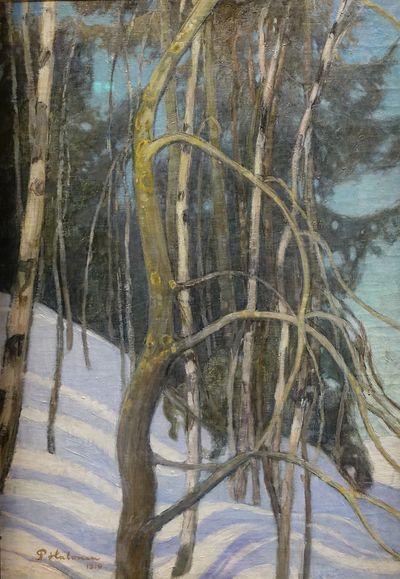 Pekka Halonen. Forêt enneigée, 1916. Huile sur contreplaqué. Collection particulière. |