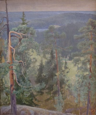 Pour le pavillon finlandais à l'Exposition universelle de Paris en 1900, Albert Edelfelt réalise deux grands paysages: Vue sur Haikko, avec sa lumière crépusculaire, son premier plan parsemé de conifères et la trouée sur un lac, est typique du paysage romantique national.