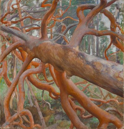 Grand pin de Kotavuori est l'une des œuvres les plus radicales de Pekka Halonen en matière de cadrage: la puissante diagonale projette le spectateur dans le tableau, le faisant fusionner avec l'arbre. L'image de ce pin abattu aux branches entremêlées témoigne de l’empathie de l'artiste avec la nature. Conscient de l'exploitation des ressources naturelles pour l’industrie du bois en pleine expansion, le peintre alerte avec ce portrait d'arbre sur l'inévitable dégradation de cet environnement sauvage. |